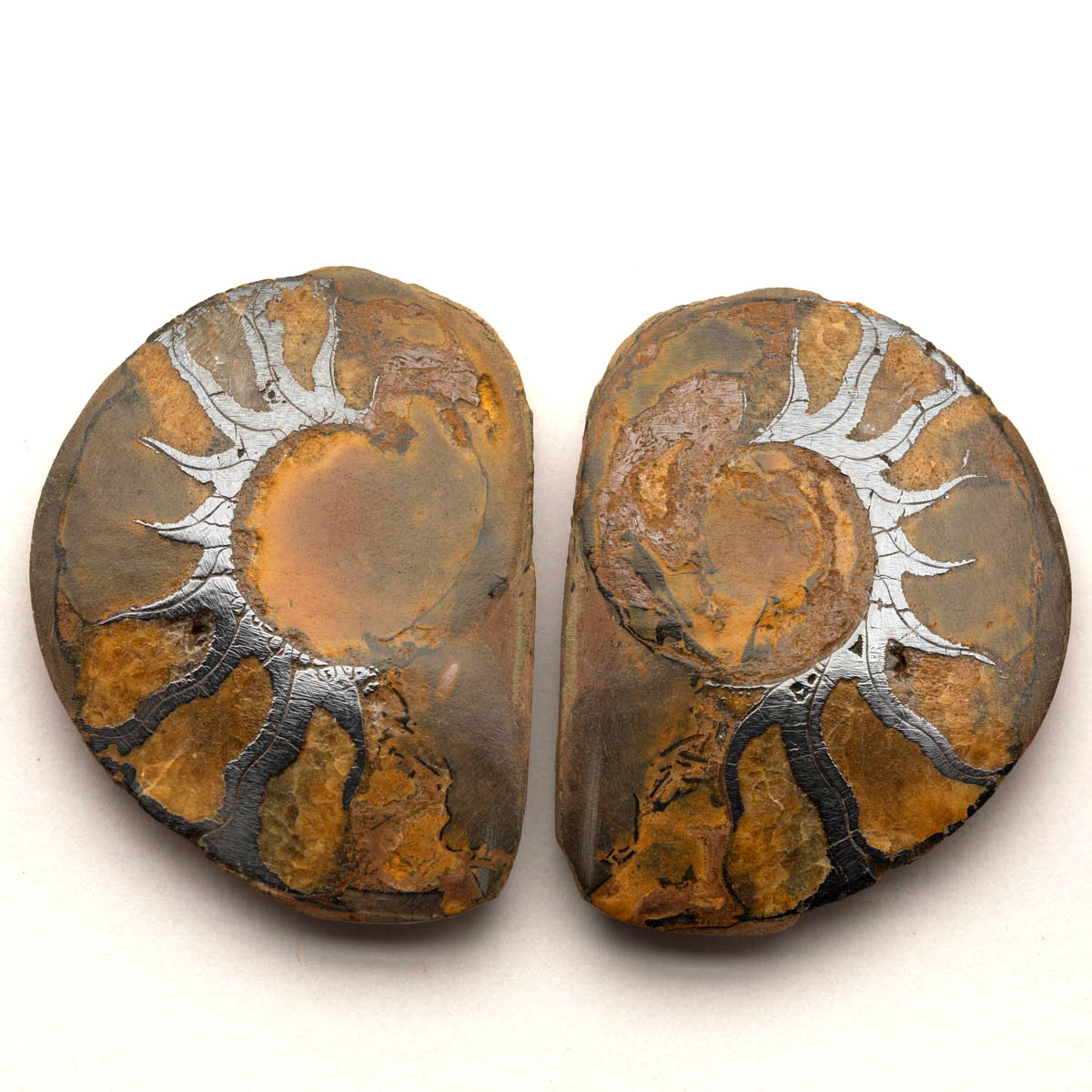 Ammonit Kluven i 2 delar och polerad på insidan, rå på utsidan.