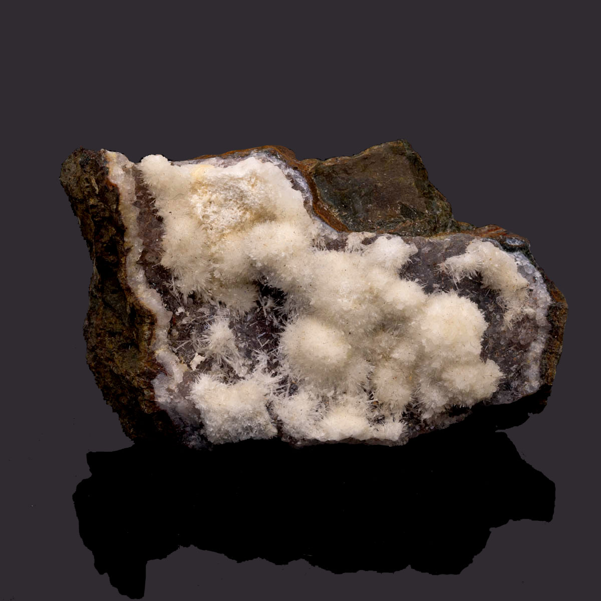 Vita radiella nålformade aragonitkristaller på botten av kvarts